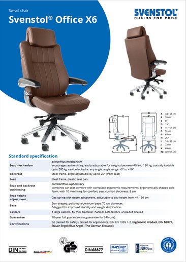 The Svenstol® Office X6 comes with a full ten-year guarantee! The guarantee is valid in Germany, Austria and Switzerland, Sweden, France, The Netherlands, Belgium and Luxembourg and applies to all parts and all costs connected with repair, including transport or call-out charges. Guarantee conditions for other countries are available on request